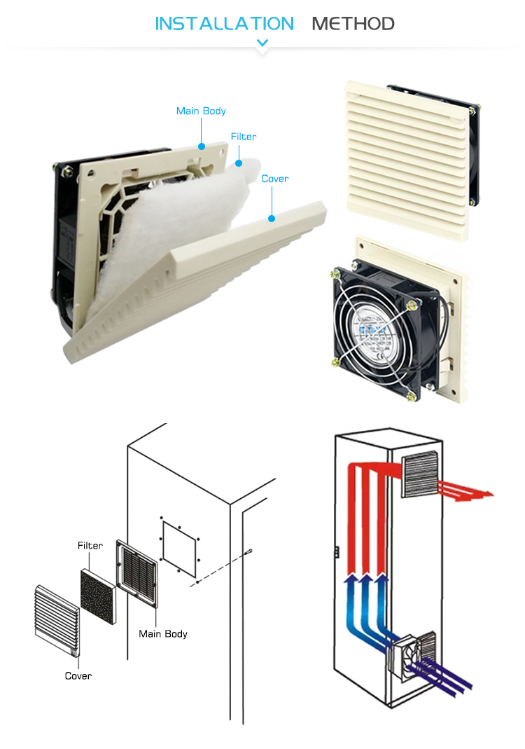 The Filter of the Fan can prevent rainwater along the filter into the control cabinet, especially with the curved surface structure cascade from the openings to prevent rainwater from entering. The non-woven fiber filter are special for preventing the dust run into the enclosure.